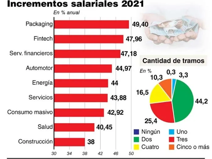 Para los no convencionados, la encuesta “Spot”, realizada por la consultora Mercer desde fines de abril a principios de mayo a compañías líderes nacionales y subsidiarias de multinacionales, verificó que los mayores incrementos se darán en: Packaging (49,4%), Fintech (47,96%); Servicios Financieros (47,18%); Retail (46,52%); Agro (46,46%); High Tech (46,41%) y Manufacturas (46,34%).