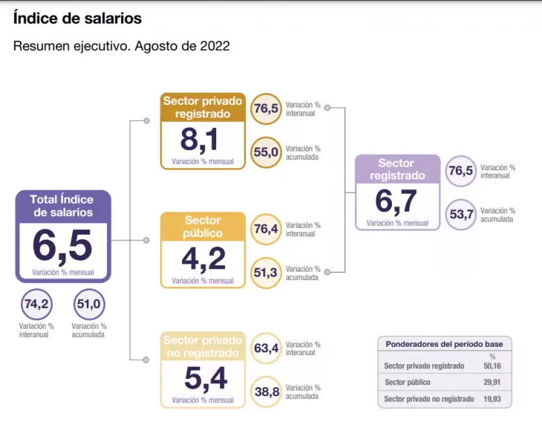 En la comparación de agosto de este año con igual mes del año pasado, el índice acumuló un alza del 74,2% en promedio, frente a una suba de precios del 78,5% producto de un incremento del 76,5 % en los sueldos de los trabajadores privados, del 76,4% en los de los empleados públicos, y del 63,4% en los trabajadores informales.